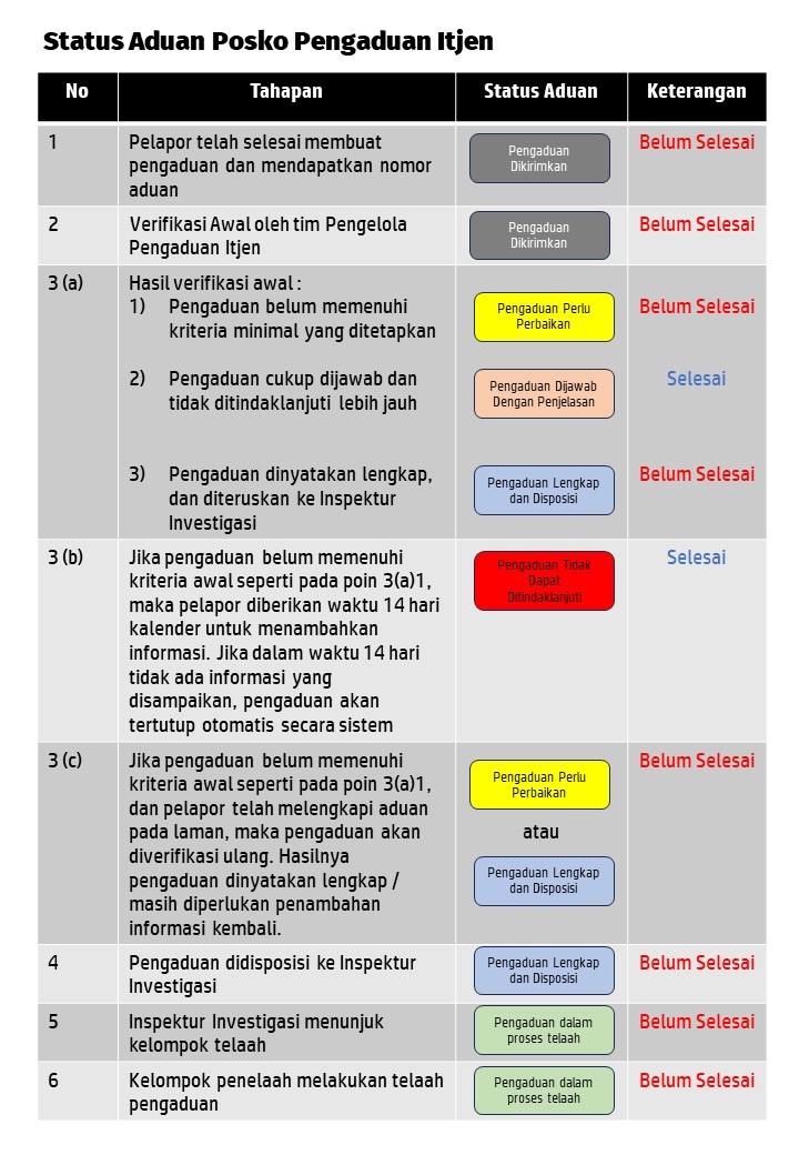 Pada prinsipnya, seluruh pengaduan yang masuk akan ditindaklanjuti sesuai dengan ketentuan dan prosedur yang berlaku (No Wrong Door Policy) di Inspektorat Jenderal. Secara umum pelaporan pengaduan disarankan dilaporkan melalui laman berikut.
