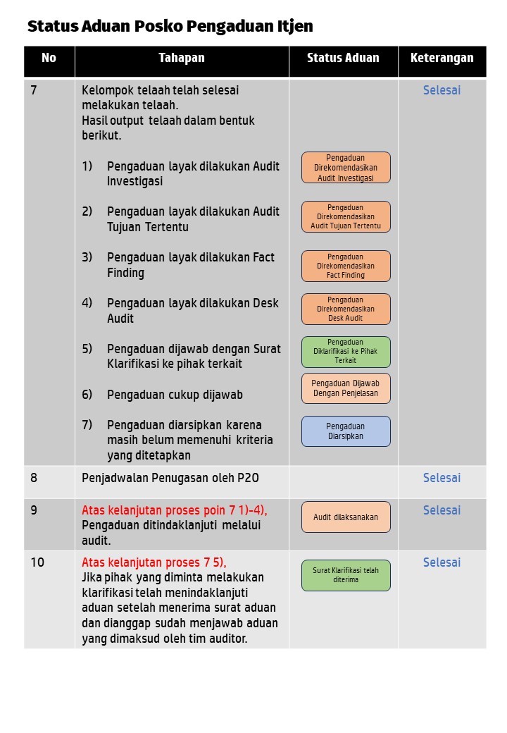 Pada prinsipnya, seluruh pengaduan yang masuk akan ditindaklanjuti sesuai dengan ketentuan dan prosedur yang berlaku (No Wrong Door Policy) di Inspektorat Jenderal. Secara umum pelaporan pengaduan disarankan dilaporkan melalui laman berikut.